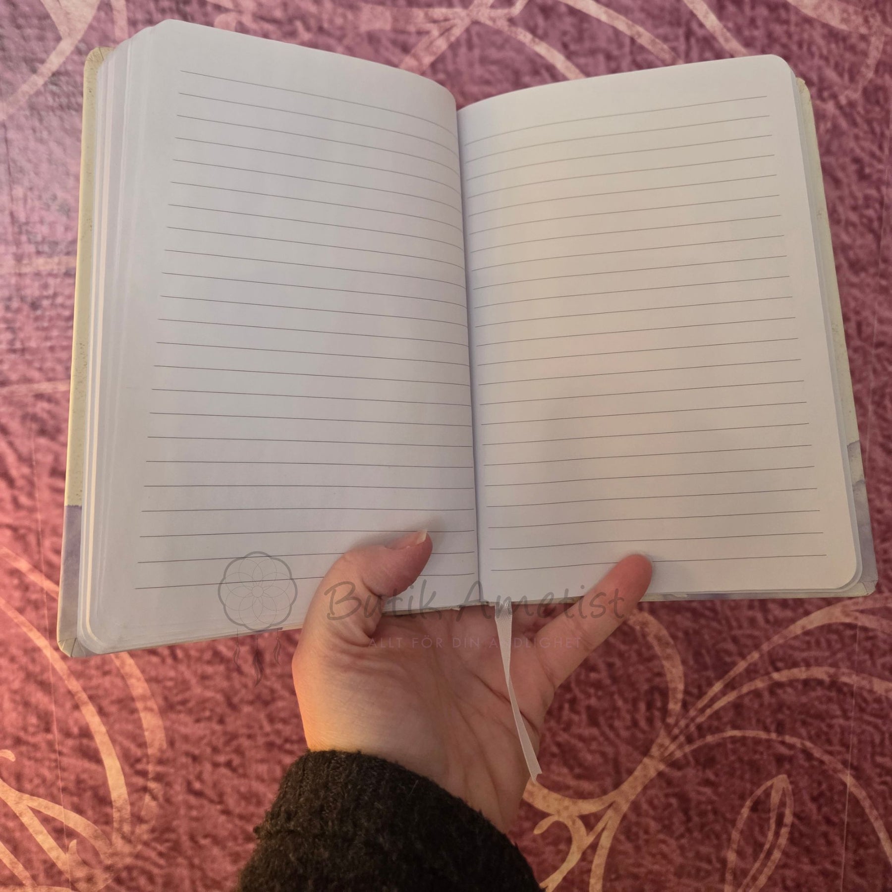 Fin skrivbok i A5-format med hårda pärmar. Linjerade sidor, och sidenband som bokmärke.