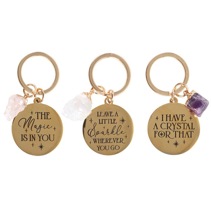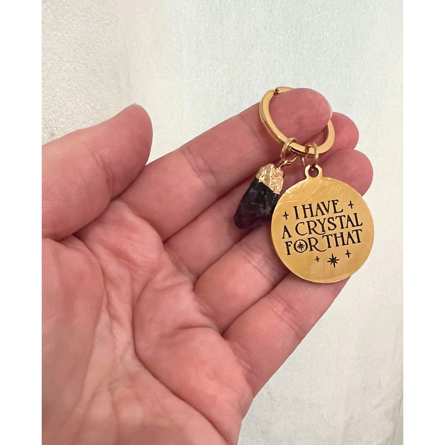 Snygg nyckelring i guldfärgad metall, med rå sten, och skojig text på engelska.