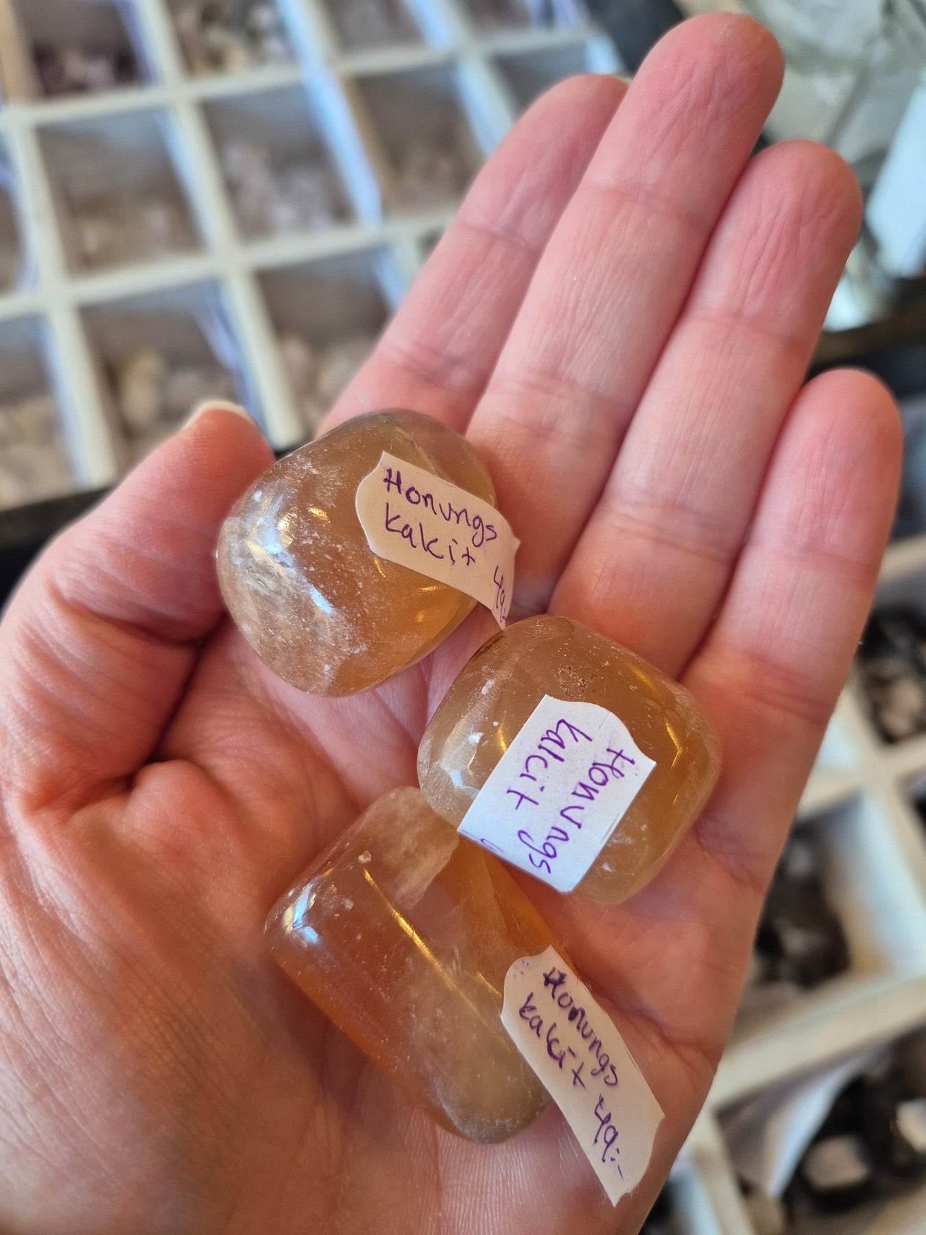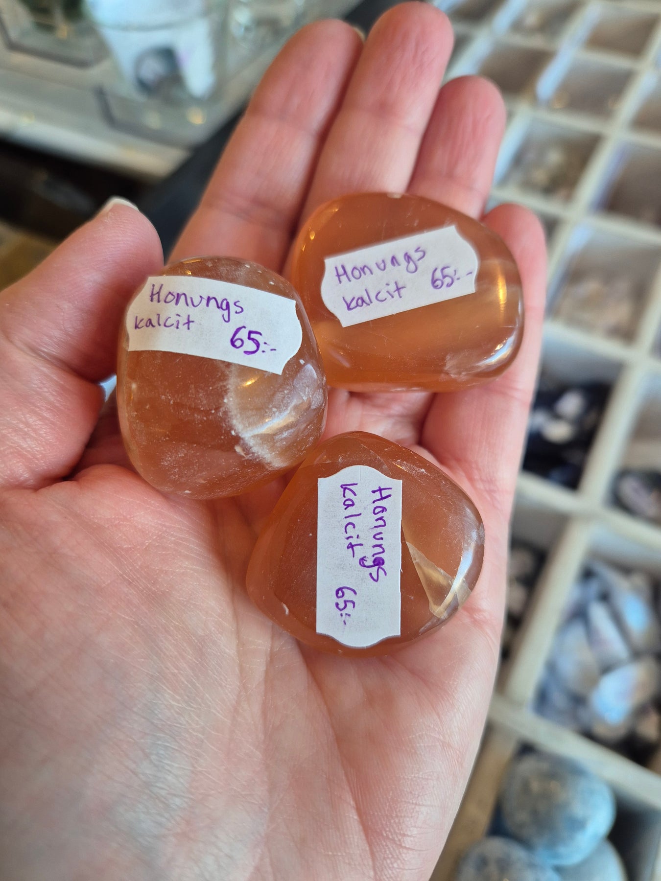Honungskalcit har en härlig gyllene honungsfärg. Lär vara en mycket andlig kristall som kopplar oss samman med Universums energi. Vid kristallhealing för att balansera solar plexus och stärka det chakrats kontakt med navelchakrat. Brukar även användas för almmän stärkning av immunförsvaret vid healing.