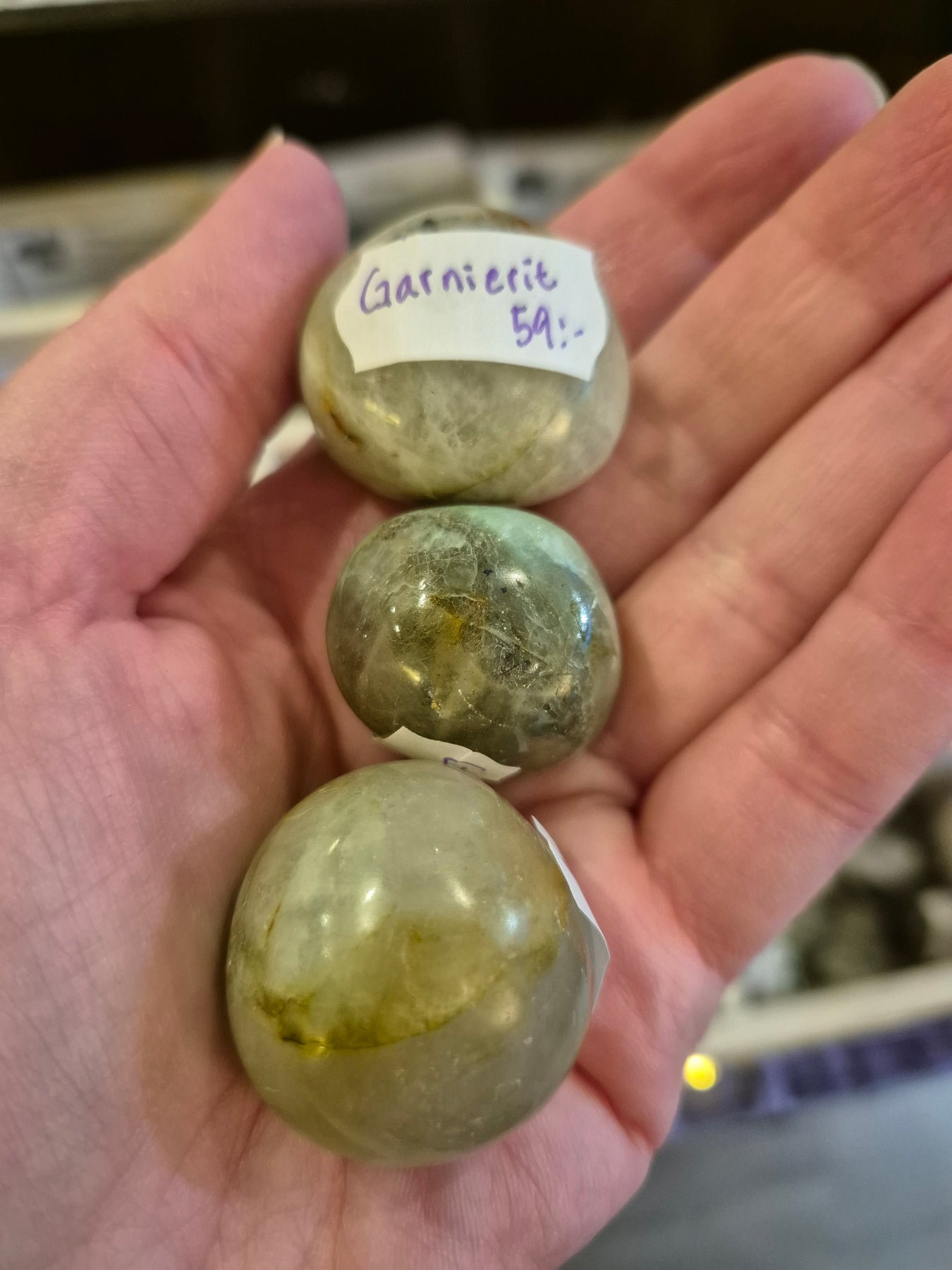Trumlad, ca 25-30 mm. Kallas även grön månsten. Worry-stone är platt och ca 40-50 mm, mer grön/limegrön.